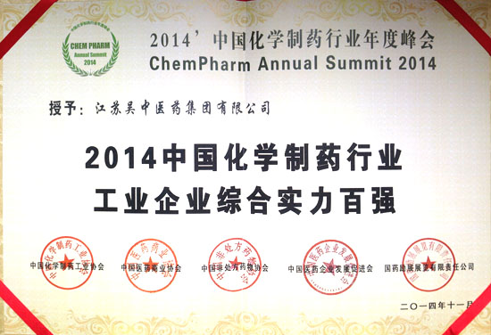 江苏吴中医药集团荣获“2014年中国化学制药行业工业企业综合实力百强”