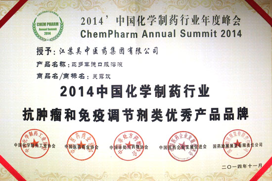 11月26日在广州召开“2014中国化学制药行业年度峰会”。会议围绕“质量·诚信·品牌”主题,邀请政府相关部门负责人和有关专家出席并作主题演讲,同时发布优秀企业和优秀产品品牌榜。永利总站获得“2014年中国化学制药行业工业企业综合实力百强”,其产品“匹多莫德口服溶液(芙露饮)”获得抗肿瘤和免疫调节剂类优秀产品品牌。