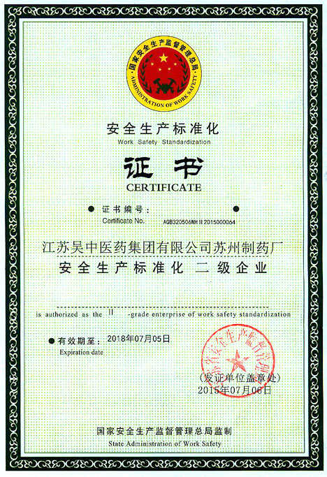 2015年7月省安监局对我厂二级标准化达标进行了网上公示,历经三个月,同年10月10号,吴中区安监局来我厂颁发了二级标准化证书和牌匾,我厂正式通过安全生产标准化二级测评,获得了安全生产标准化二级企业证书和牌匾。