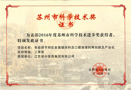 匹多莫德原料及口服溶液荣获苏州市科学技术进步三等奖