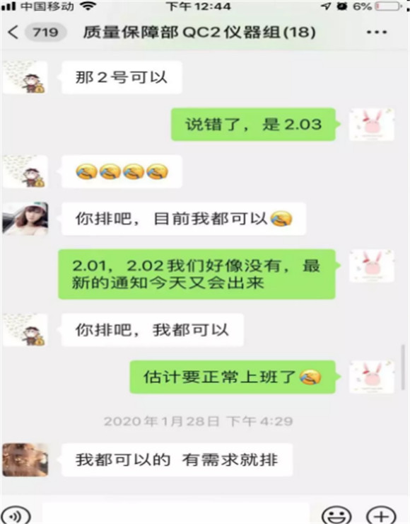 (春节假期,QC仪器组的微信群聊天记录,大家纷纷表示只要工作有需要,自己随时都能上!希望能为公司在最需要的时候献出自己一份绵薄之力。)