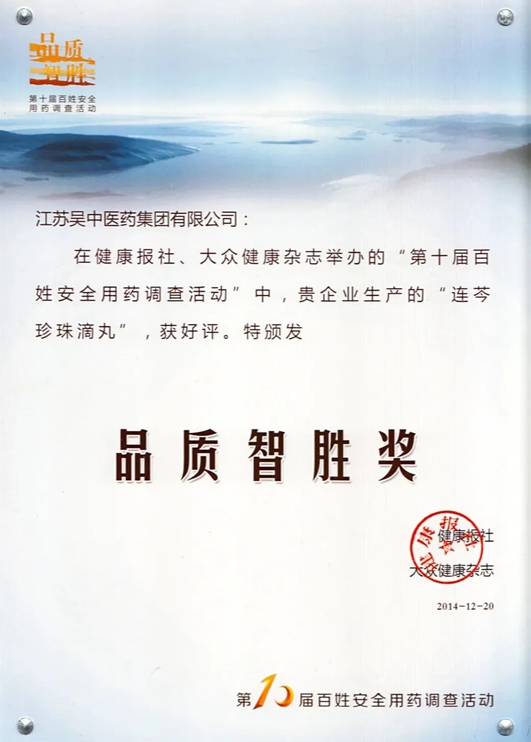 (2014年健康报“第十届百姓安全用药调查活动”荣获品质智胜奖)