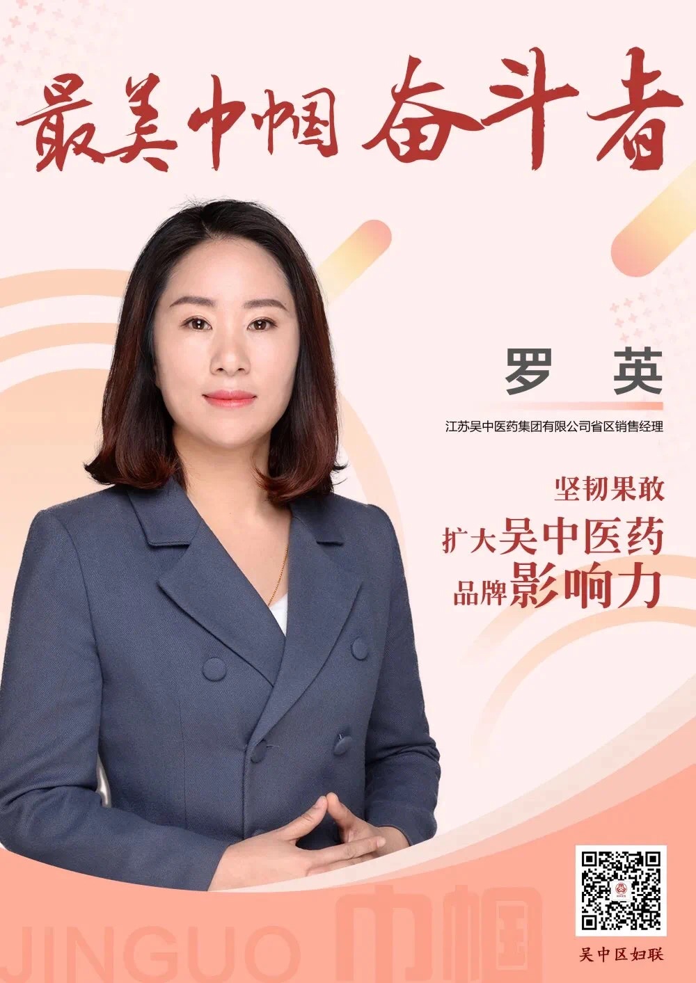 为讴歌建区20年来奋斗在吴中区各行各业、各领域的先进女性,吴中区妇联在“三八”国际妇女节来临之际,命名20名同志为吴中区“最美巾帼奋斗者”,医药集团省区经理罗英,榜上有名。