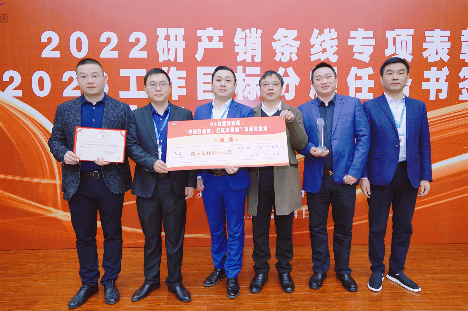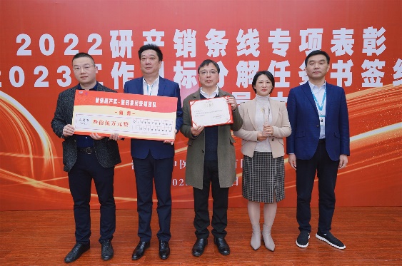 会上表彰了2022年度研产销条线优秀团队和个人,颁发了项目推动奖、效益提升奖、技术攻关奖等7个研发奖项,对外合作效益奖、研发支持奖等2个生产奖项,四季度攻坚竞赛奖、营销超产奖等2个营销奖项。股份公司董事长、首席执行官钱群山为获奖团队颁奖。