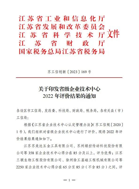 江苏吴中医药发展股份有限公司在2022年省级企业技术中心评价中获评优秀 日期:2023年5月17日