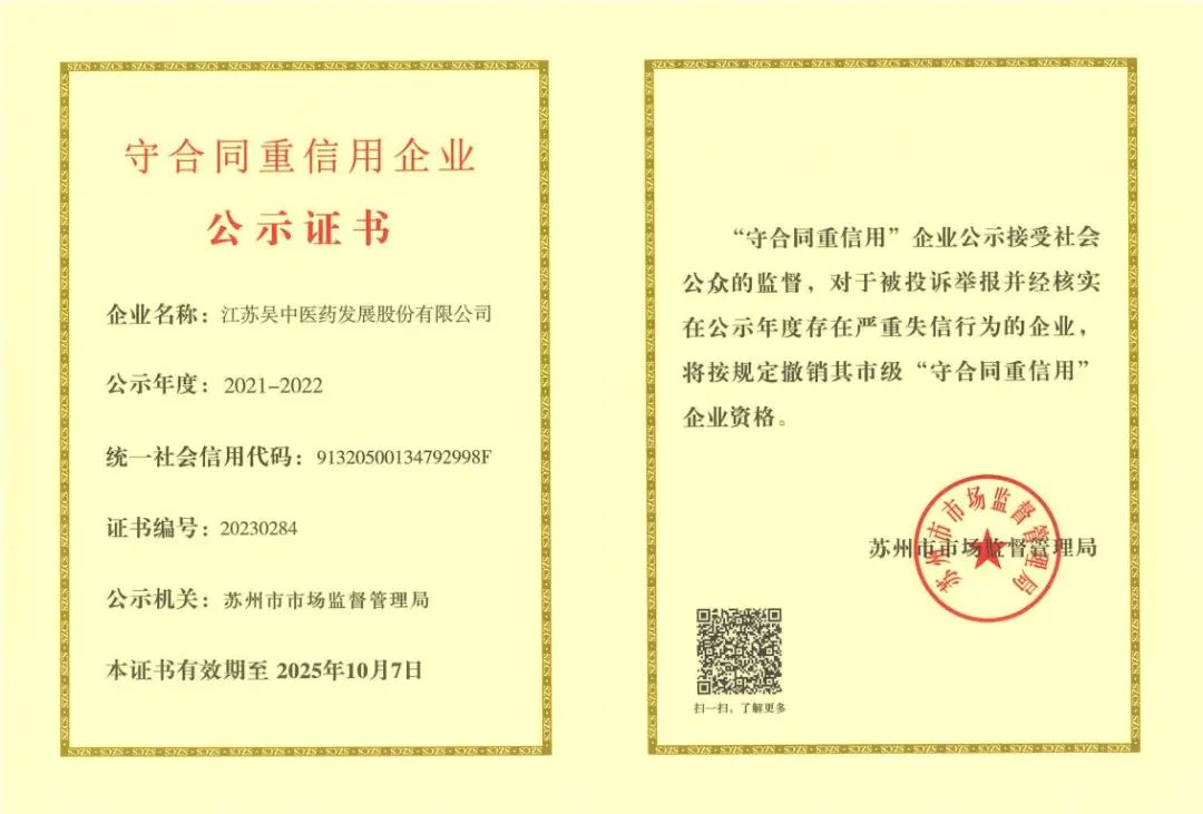 近日,永利总站及其母公司江苏吴中医药发展股份有限公司再度获评2021-2022年度苏州市“守合同重信用”企业,公司连续多年获评,是公司守法经营、深入推动诚信建设、坚持诚信履约的重要体现,也是社会各界对企业长期诚信经营的肯定。