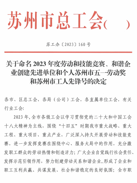 近期,苏州市总工会印发《关于命名2023年度劳动和技能竞赛、和谐企业创建先进单位和个人苏州市五一劳动奖和苏州市工人先锋号的决定》,公司员工李慧荣获“苏州市五一劳动奖章”!