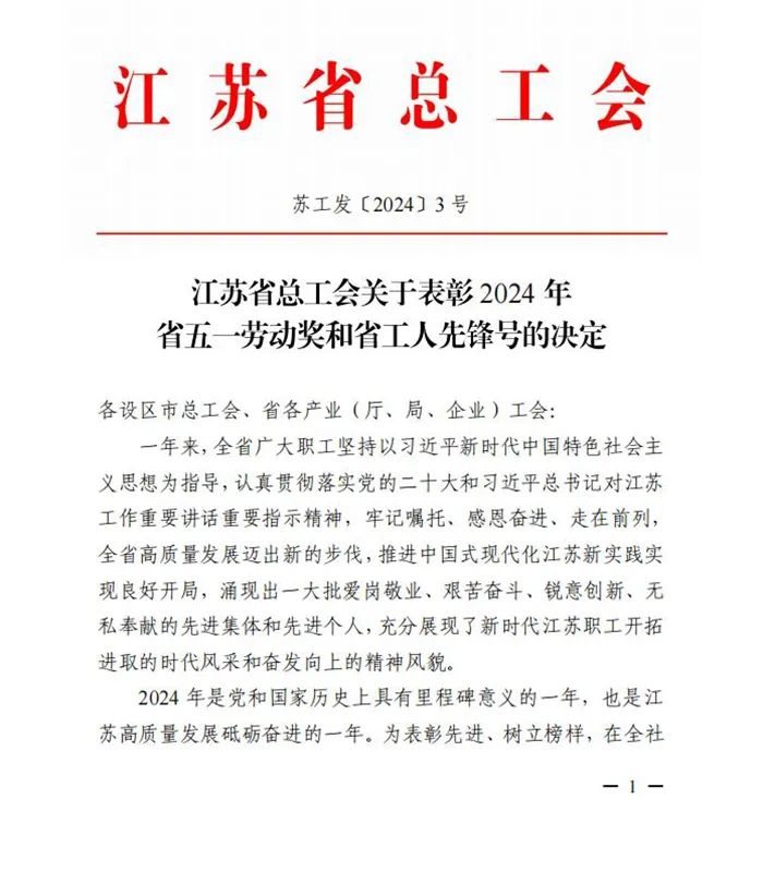 荣誉:母公司获评江苏省五一劳动奖状 日期:2024年4月23日