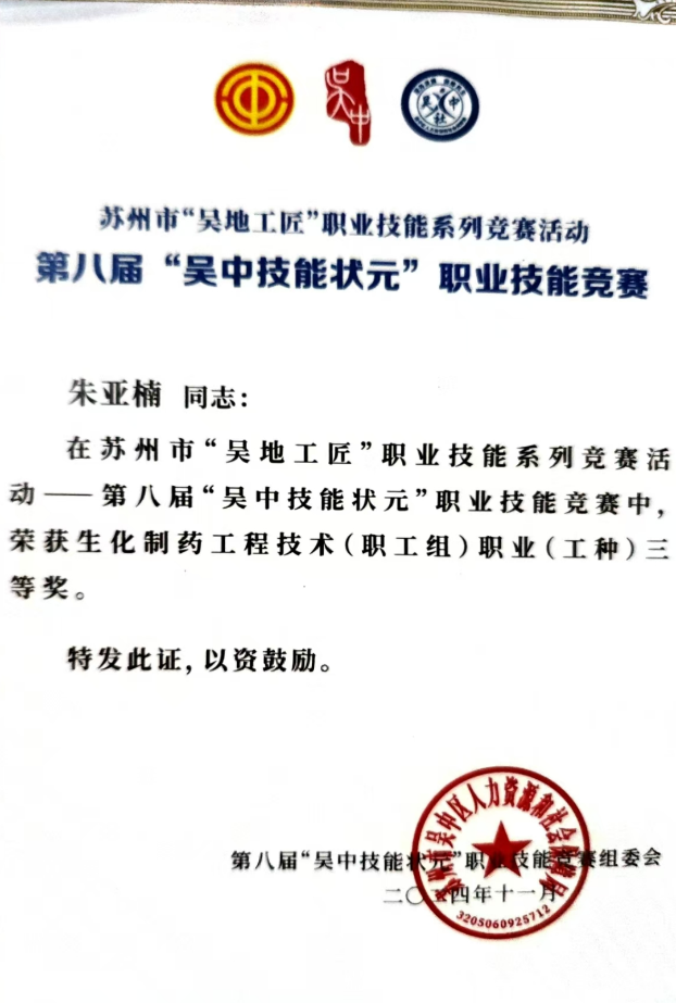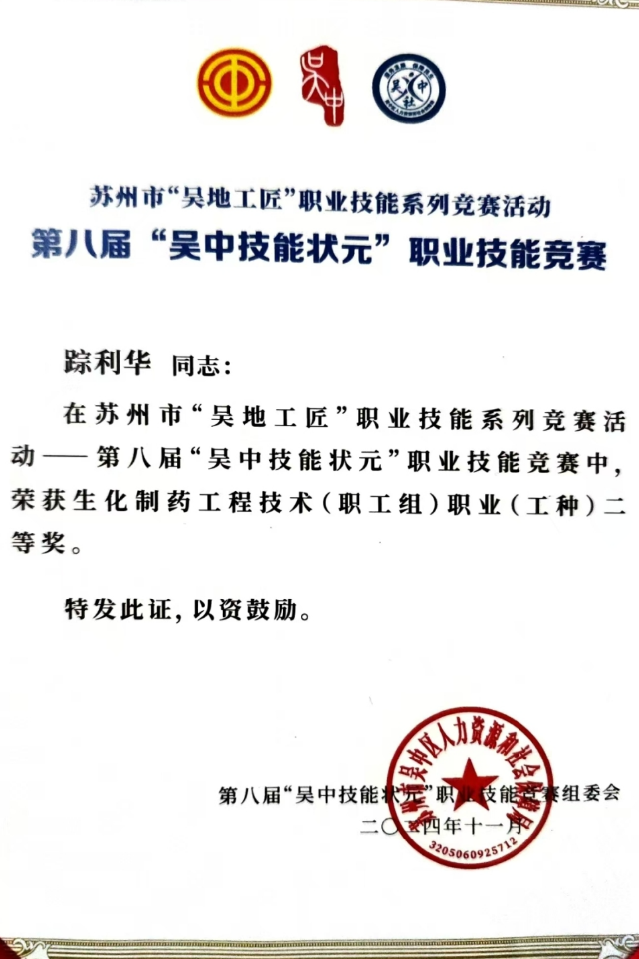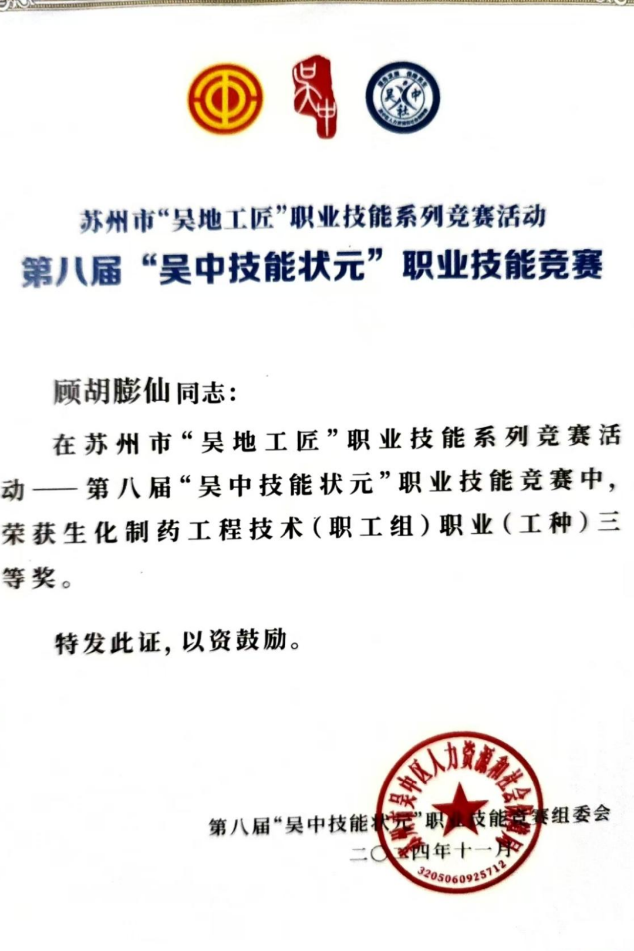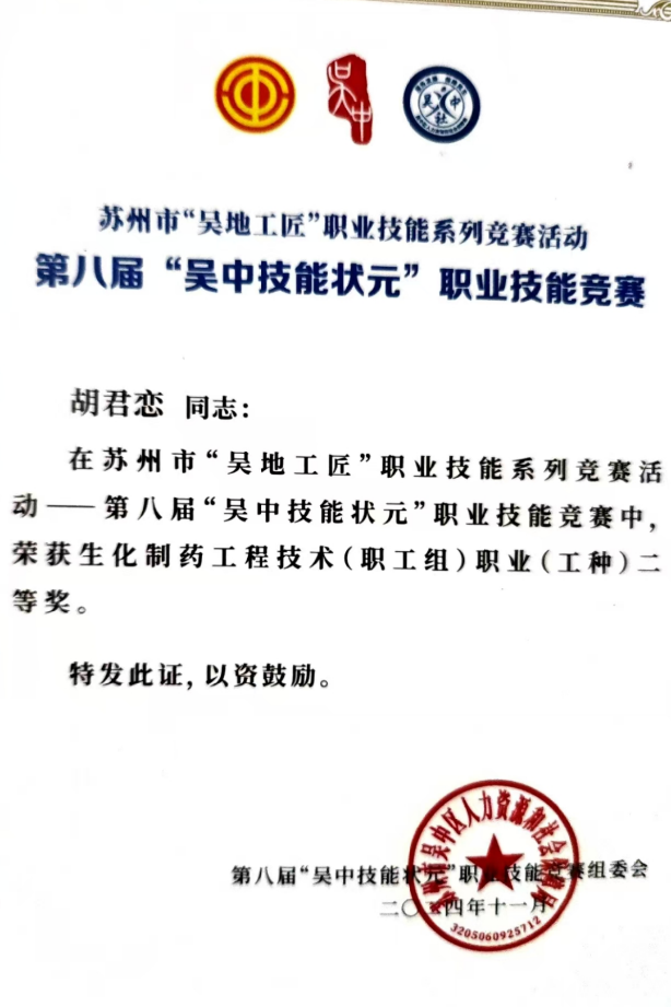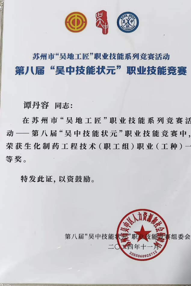 公司参赛选手赛前认真准备、赛中严格遵守规则、赛后积极复盘总结,在本次竞赛中取得了优异成绩。其中,苏州制药厂质量保障部QC的6位员工在生化制药工程技术(职工组)职业(工种)系列比赛中硕果累累,谭丹容荣获一等奖,胡君恋和踪利华荣获二等奖,朱亚楠、顾胡膨仙和刘静荣获三等奖。
