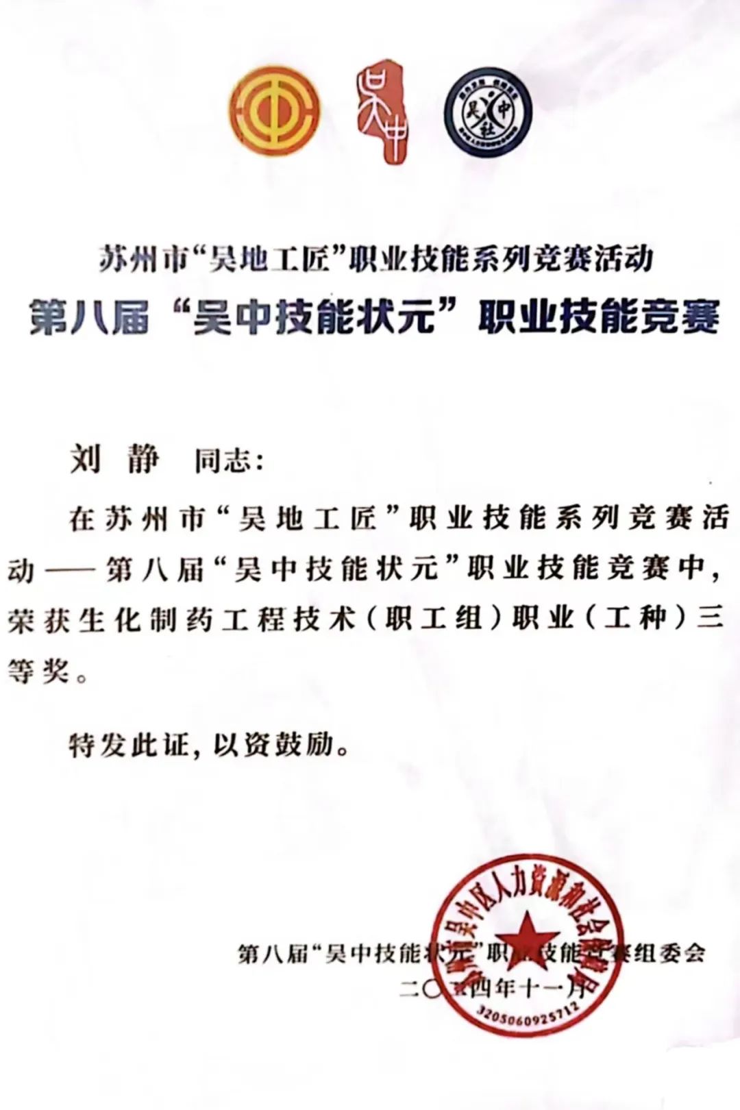 喜报公司员工在第八届“吴中技能状元”职业技能竞赛中喜获佳绩