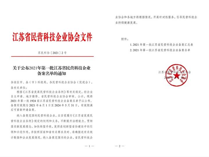 根据《关于公布2021年第一批江苏省民营科技企业备案名单的通知》(苏民科协〔2021〕2号),永利总站入选2021年第一批江苏省民营科技企业备案名单,吴中医药自2016年起连续入选江苏省民营科技企业。